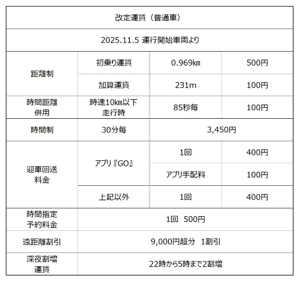 2025年11月5日運行開始車両より新たなタクシー運賃にて営業させて頂きますので、下記のとおりご案内申し上げます。